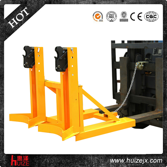 適用于桶邊薄和變型的桶,純機(jī)械機(jī)構(gòu)設(shè)計(jì)可與叉車方便地配合,僅依靠叉車的動(dòng)作,不需要其它的動(dòng)力,可自動(dòng)一次搬運(yùn)2個(gè)桶,能處理更多類型的桶,包括鋼制油桶和塑料油桶,能在集裝箱等這樣狹小的環(huán)境內(nèi)裝卸桶裝物質(zhì),可極大地提高空間利用率, 與貨叉連接配有自鎖裝置確保油桶夾在坡度上和顛簸路面使用時(shí)不會(huì)滑落.